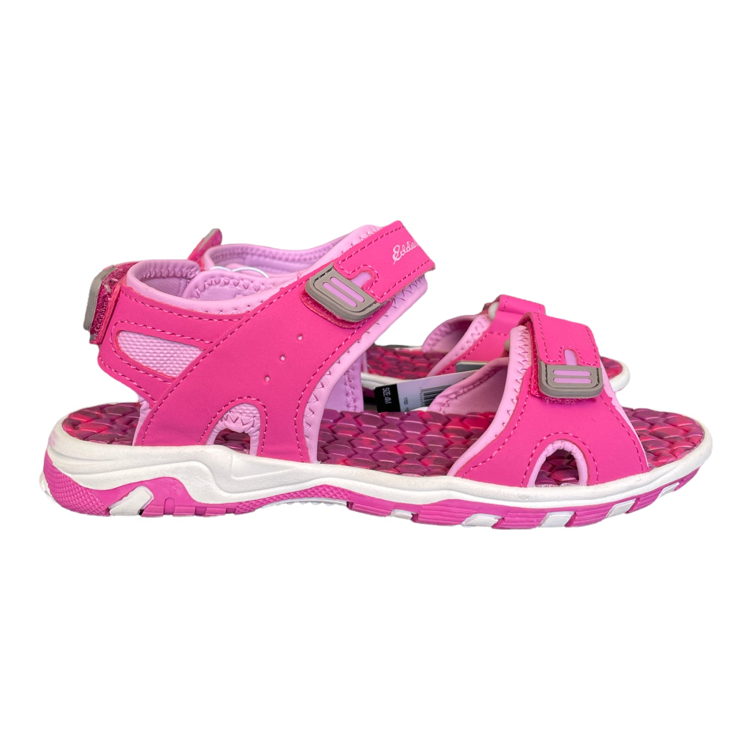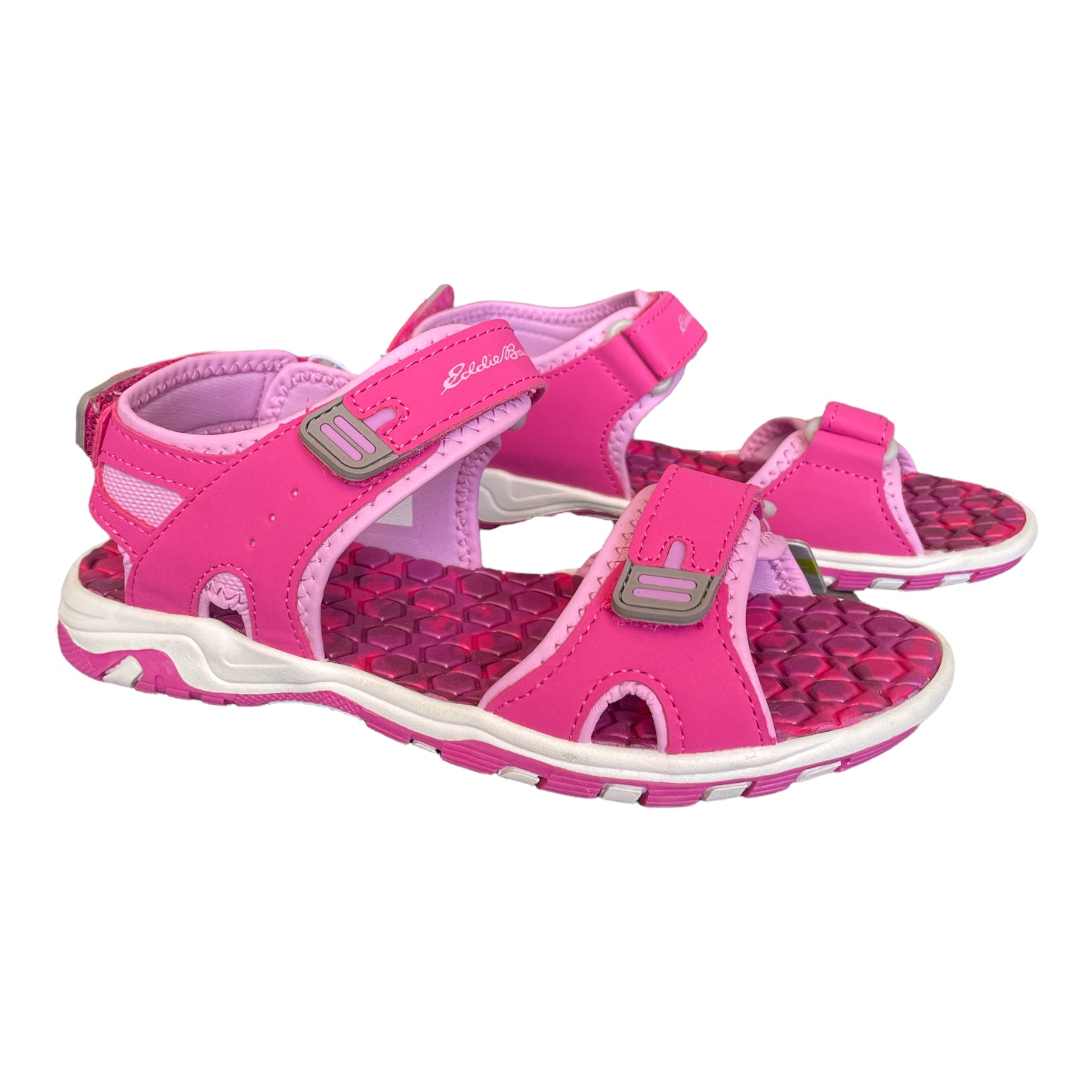 The Eddie Bauer Girl's River Sandal combines the functionality of a traditional outdoor rugged sandal with specific needs for today's active children. It features a water-ready functional upper with three adjustable velcro straps for a semi-customized fit. The upper straps are constructed with "rolled comfort edges" to protect against rough sandal strap edges when walking, wading or running through puddles with friends at a summer barbeque, the lake with family or heading to the local pool for summer fun. It is also built with a water-ready flexible footbed and traction gripping outsole. This functionality, along with the quick-dry upper helps these sandals dry out quickly once out of wet environments and the traction outsole provides additional grip with walking on slippery terrain.