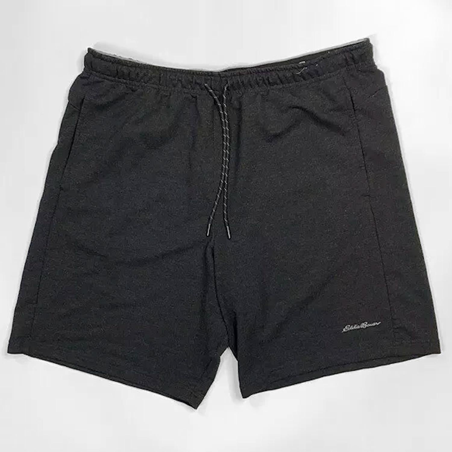 Nice lightweight men's lounge shorts. Black Heather. Mesh side pockets and Eddie Bauer logo on bottom of left leg. 50% Rayon, 45% Polyester, 5% Spandex