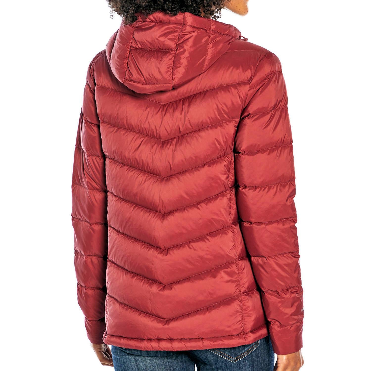 Stay ready for colder weather in this quilted-down jacket, featuring a hood with funnel neckline, zip front, slanted front zipper pockets, bungee hem with adjustable toggle, and packable design.