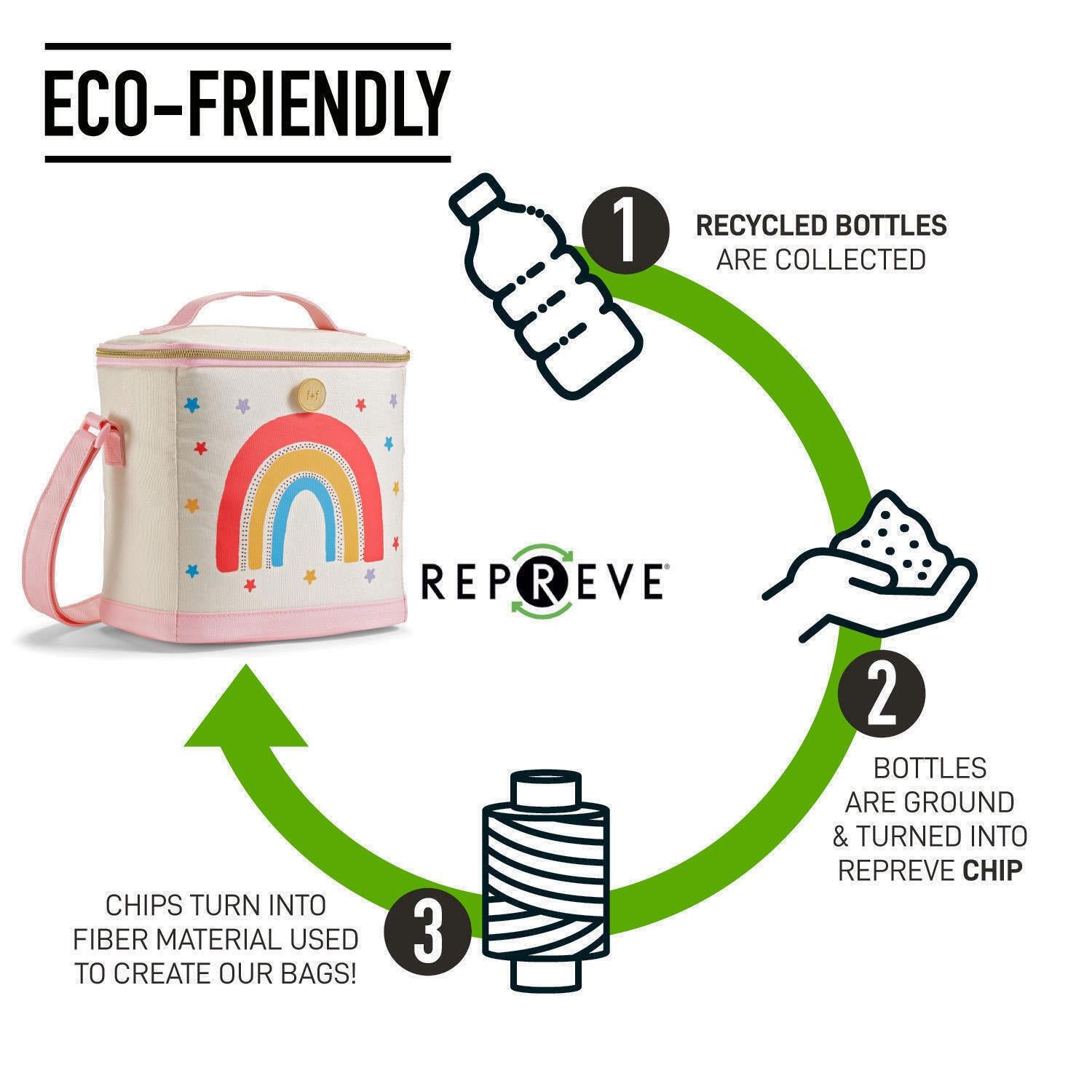 Made with six recycled plastic bottles, this repreve insulated lunch tote is designed for the planet -- and for you! This large and eco-friendly lunch bag features an adjustable shoulder-strap for hands-free carrying. Its reinforced zippered closure secures contents inside while preserving insulation. The bag's wide entry makes for quick packing and cleaning. Comes complete with two leakproof and reusable matching PEVA snack bags. Fun fact: one BPA-free snack bag equals 300 disposable bags! They're multi-purpose for all the extras: snacks, school supplies, travel items, or anything else. This is the perfect lunch kit to take to school, games, picnics, field trips, and more!