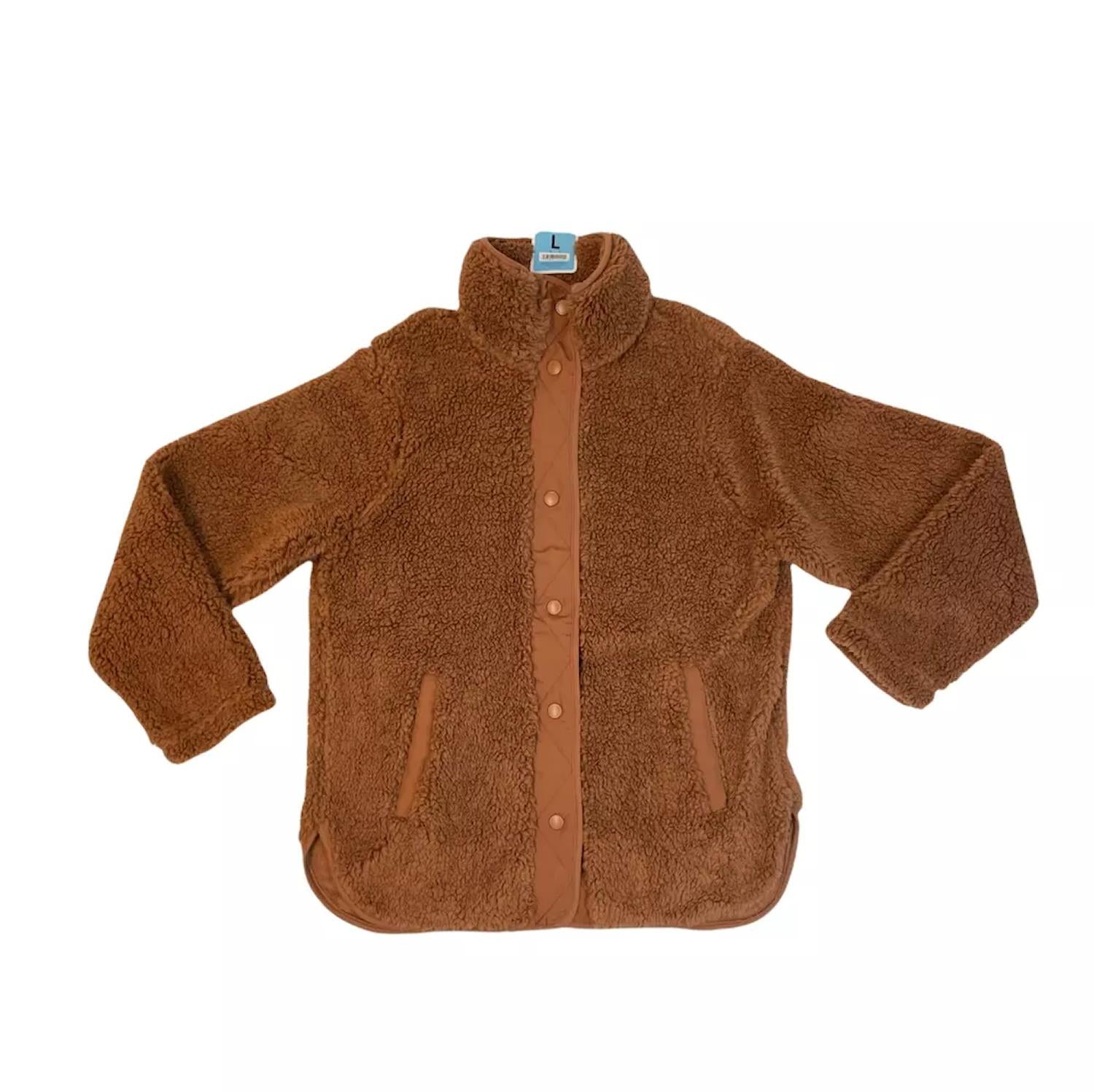 This stylish snap-up sherpa jacket is great for early autumn days or cold winter nights. Generous fit allows heavier layering underneath. 100% Polyester.