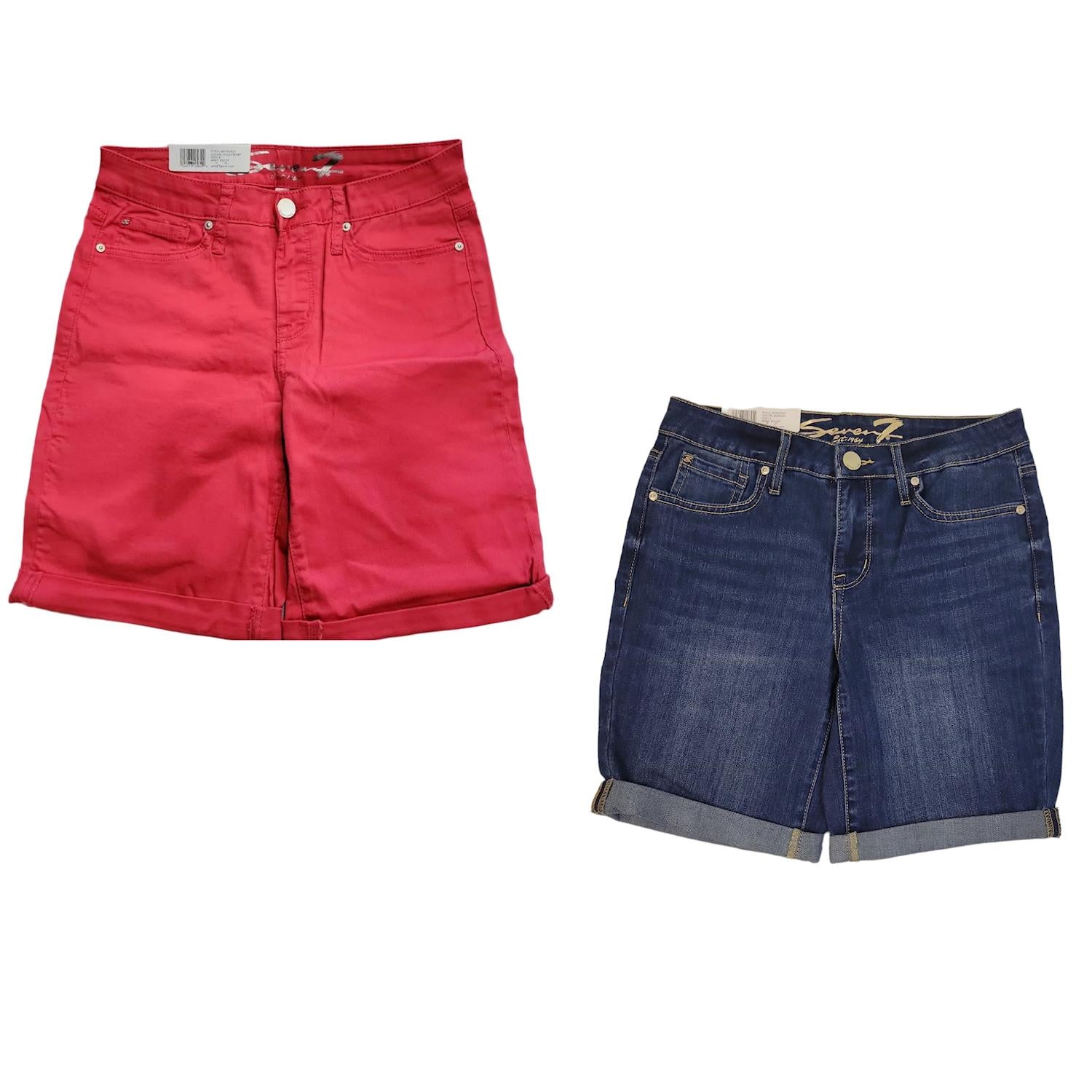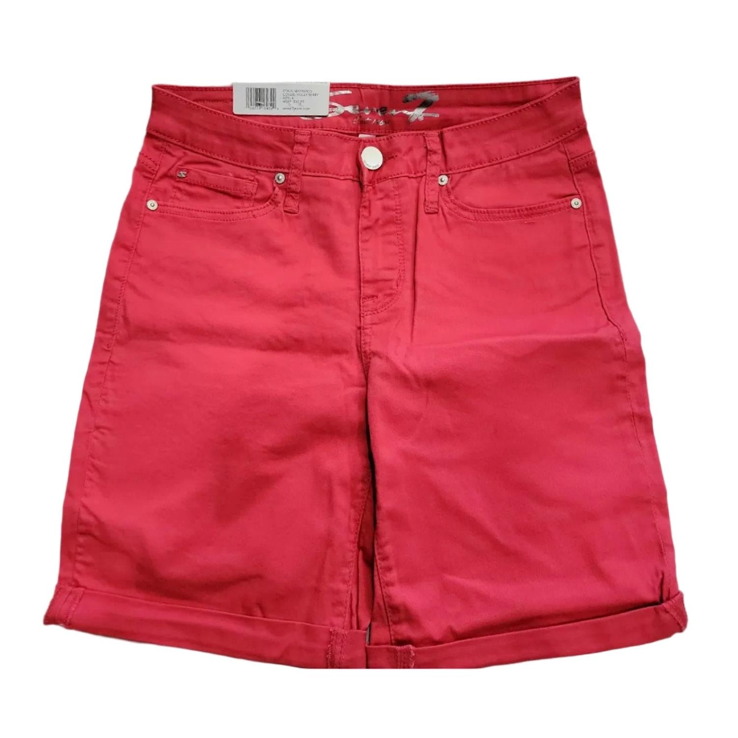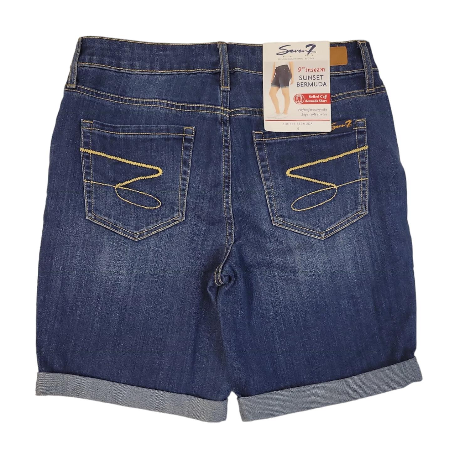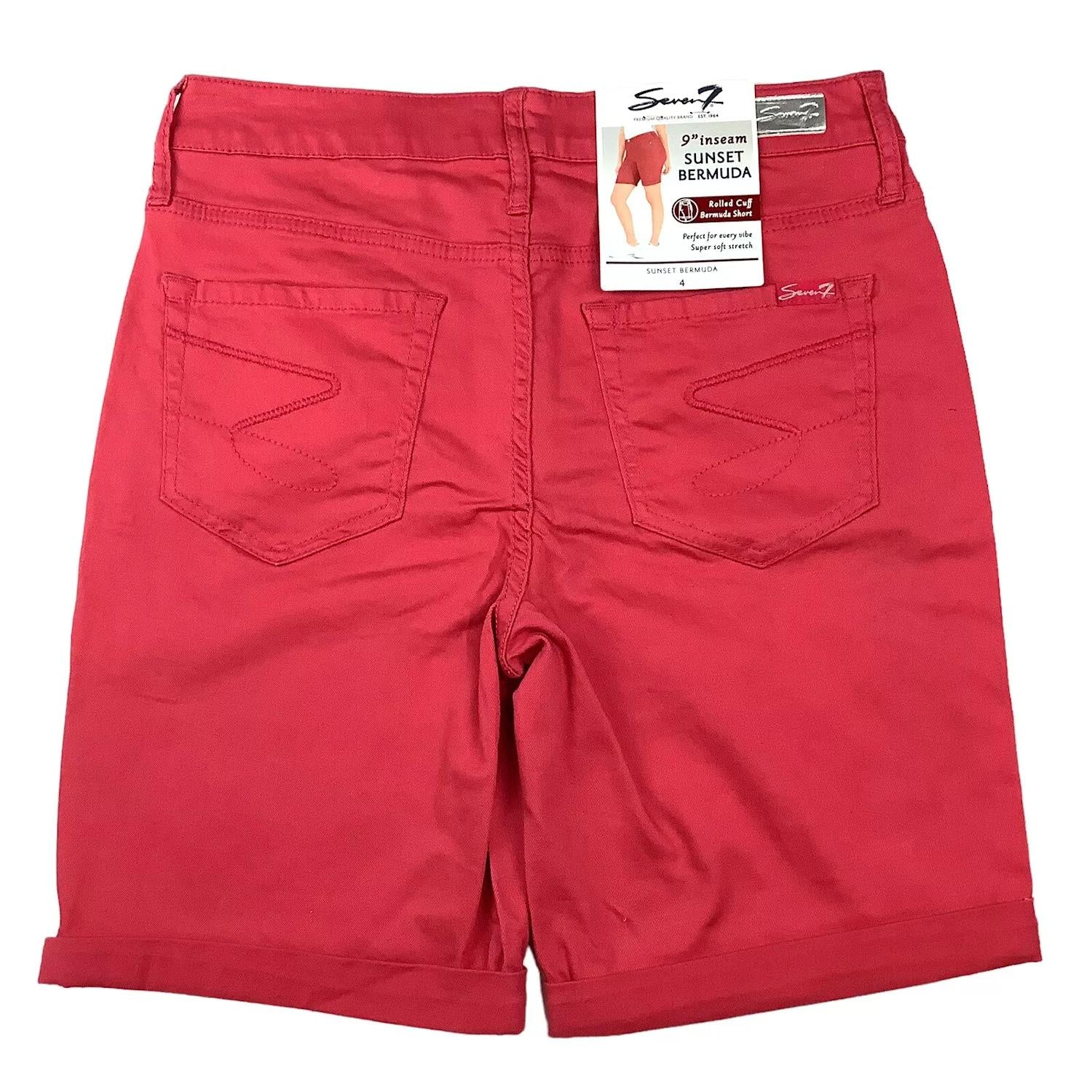 Seven7 Women's 9" Inseam Stretch Sunset Bermuda Shorts, Rolled Cuff. Our Weekend Bermuda Short is so comfortable and easy to wear you'll want to wear it straight through the work week into the weekend! With a mid ris and 9" inseam, this short is perfect for the sunshine and the sand. A double roll cuff and release hem add another unique touch to our signature fit. Jackson material: 2% Spandex, 30% Polyester, 68% Cotton, Holly Berry material: 2% Spandex, 33% Polyester, 65% Cotton