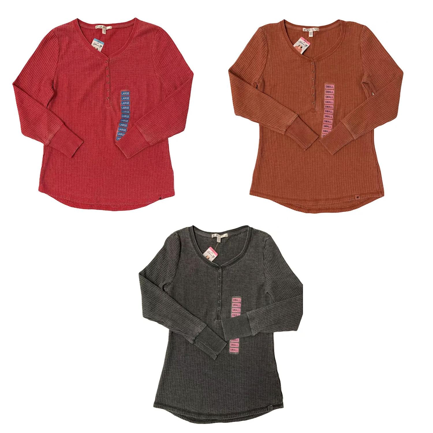 Elevate your wardrobe with this stylish Seven7 women's waffle Henley shirt. Crafted with a comfortable fit, this shirt features long sleeves, a snap closure and a flattering neckline. A super-soft waffle knit Henley-style top in a relaxed silhouette. It perfectly pairs with jeans, Ponte pants, or shorts.